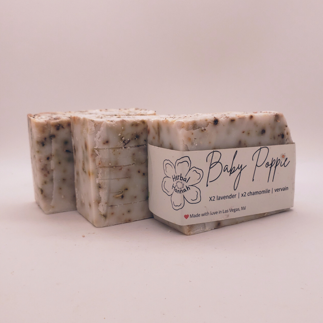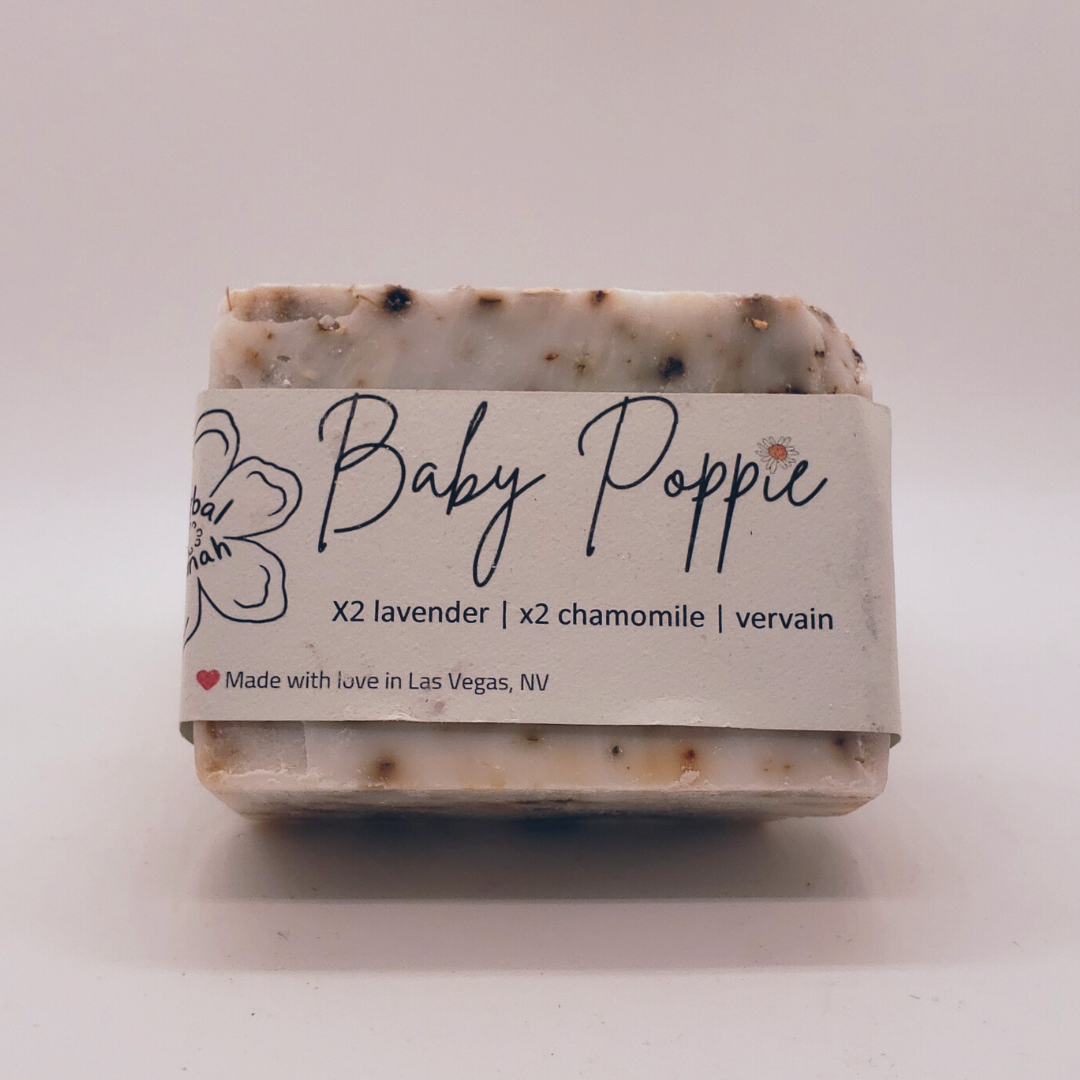 This soap was originally created for one of my friend's babies (baby Poppie) that had a super bad rash that wouldn't go away.  So, I took matters into my own hands and made a super calming blend of ingredients to put in this soap!